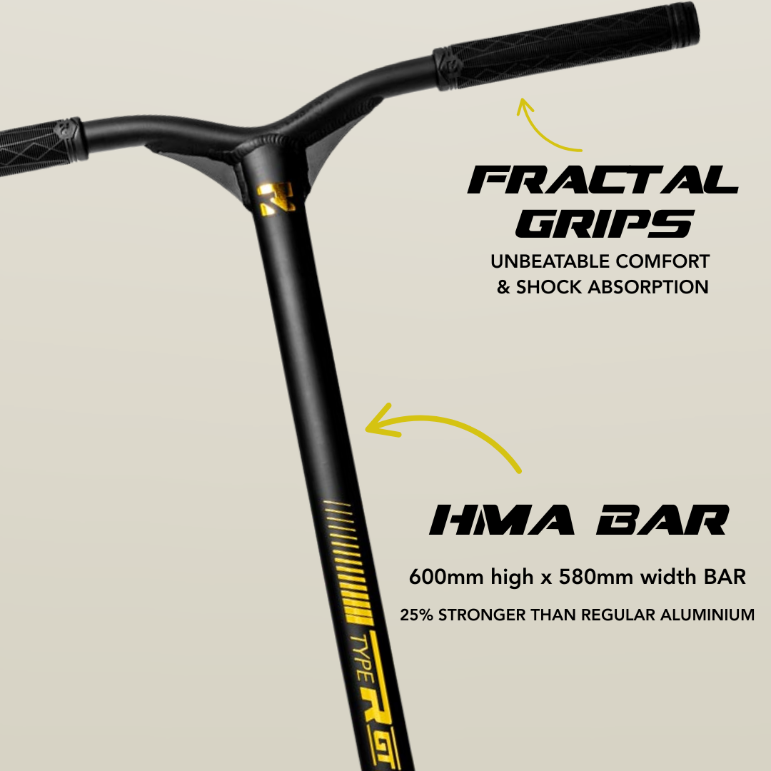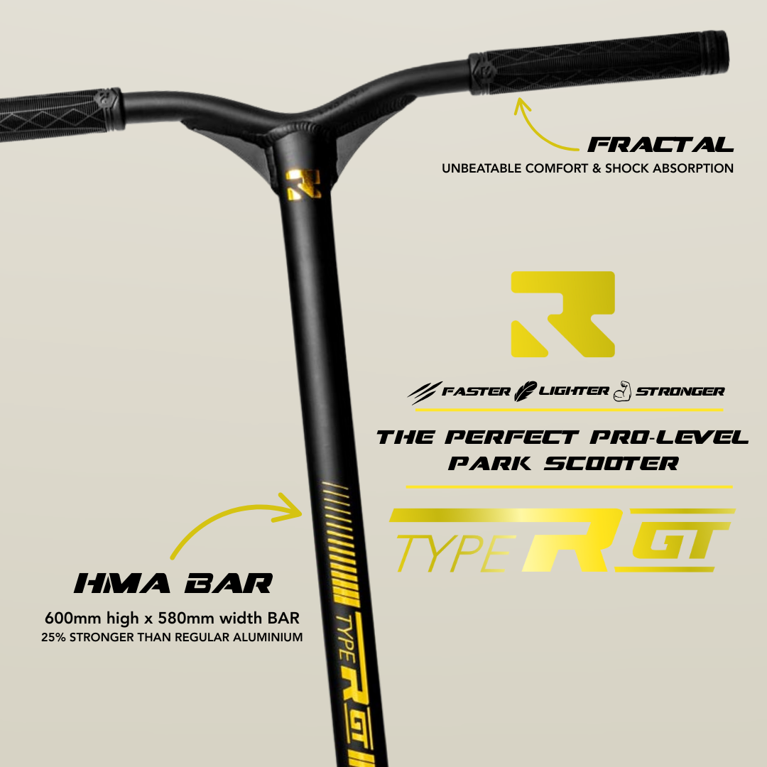 Our famous HMA bars are made from a Hi-Modulus Alloy, which retains the lightness of regular aluminium, but is 25% stronger. No other scooter bar has this unique characteristic, and now we've made them available as stock on the Type R GT scooter.